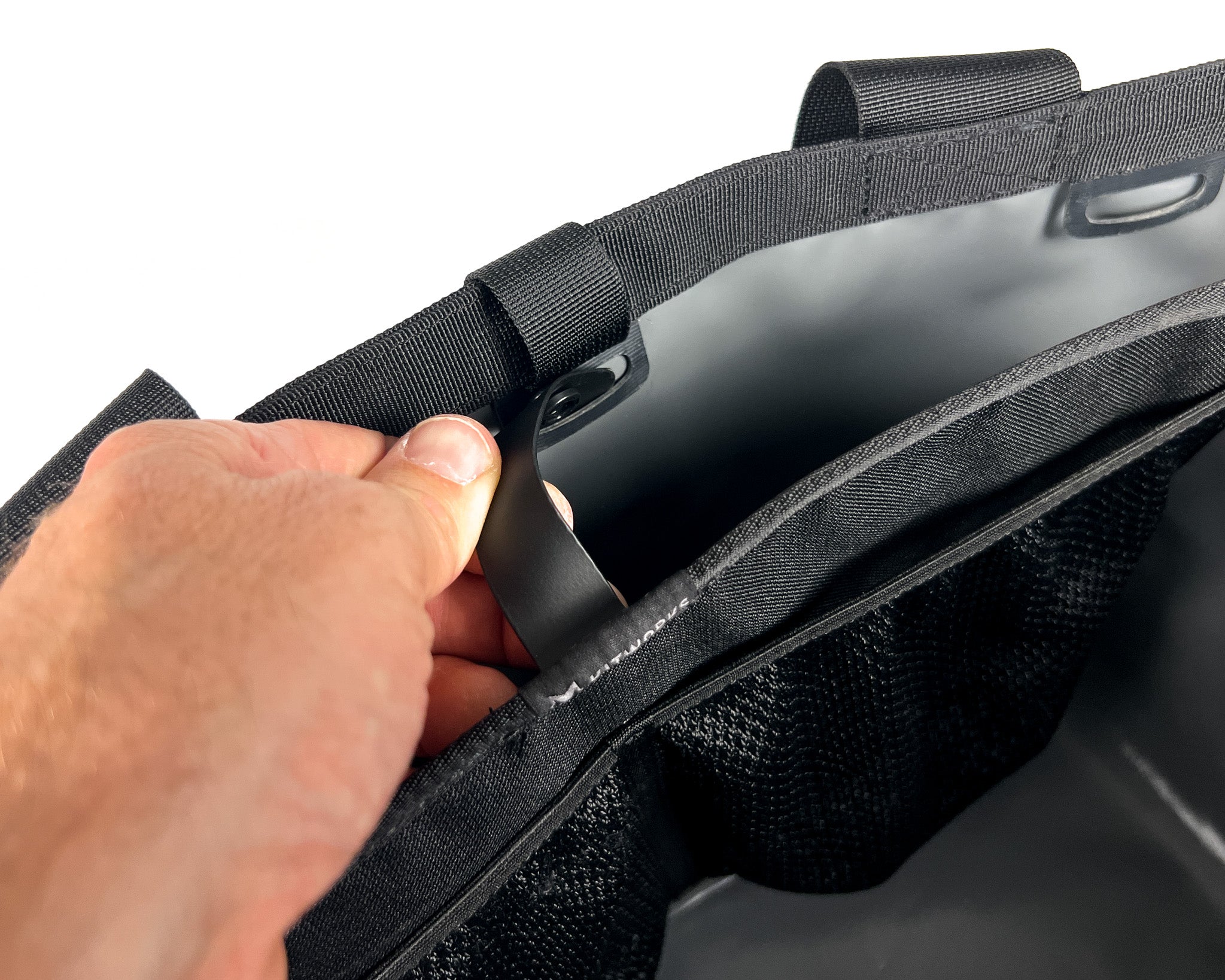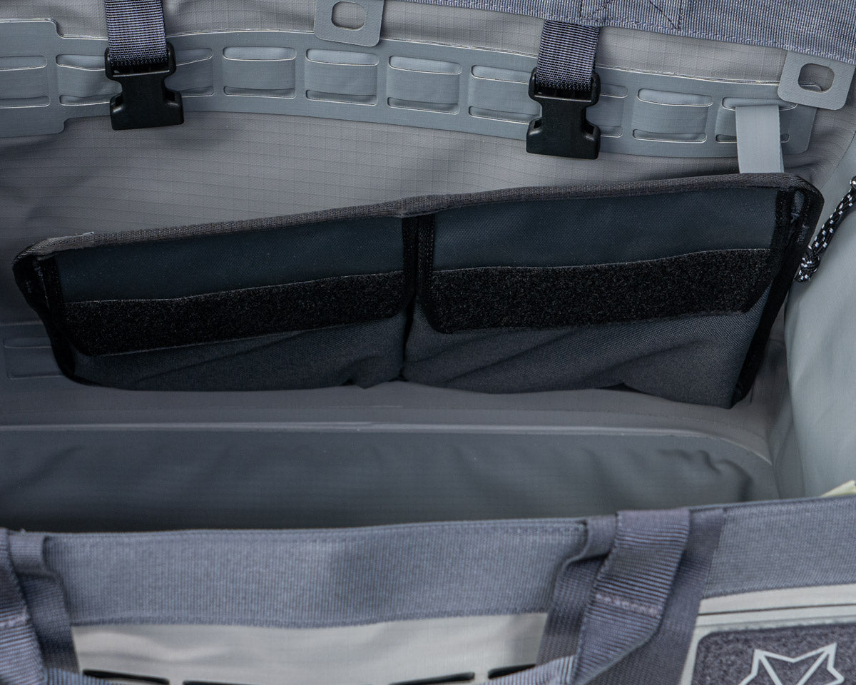 When installing pockets on your Gear Box, it's helpful to release the hinged panel prior to installation. Install bottom tabs first, and from corners toward center of gear box.