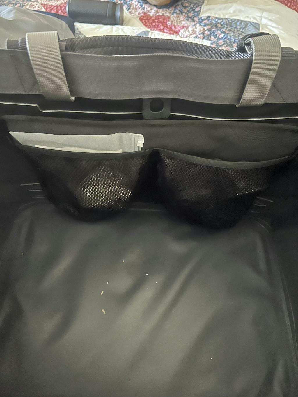 - Mesh pockets feature recycled nylon mesh.