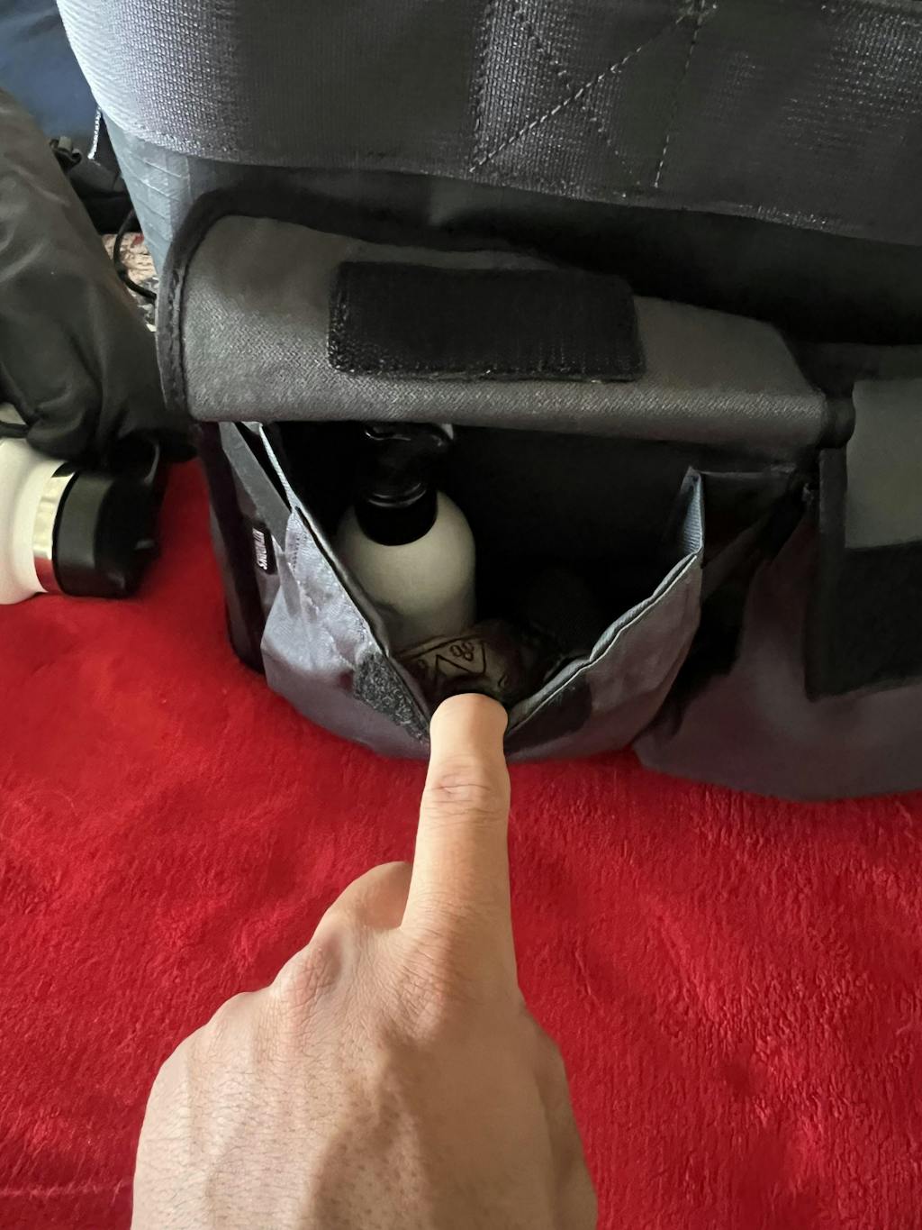 - Flap pockets feature loop patches on recycled 900D TPU coated flaps with hook and loop closure.